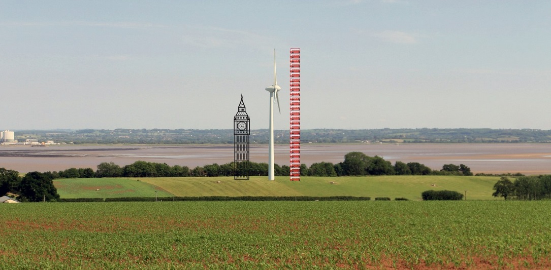 This picture shows the applicants photomontage with the accurate scale representation of Big Ben at 96m. also showing 24 Routemaster double decker buses stacked alongside the giant wind turbine! A structure over 100 feet (33m) taller than Gloucester Cathedral and visually within the landscape standing high into the skyline some 8 times as tall as Oldbury Power Station.