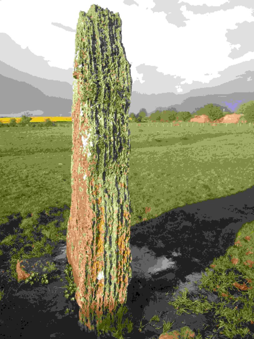 the standing stone ajoining the rail line in Stroat:
