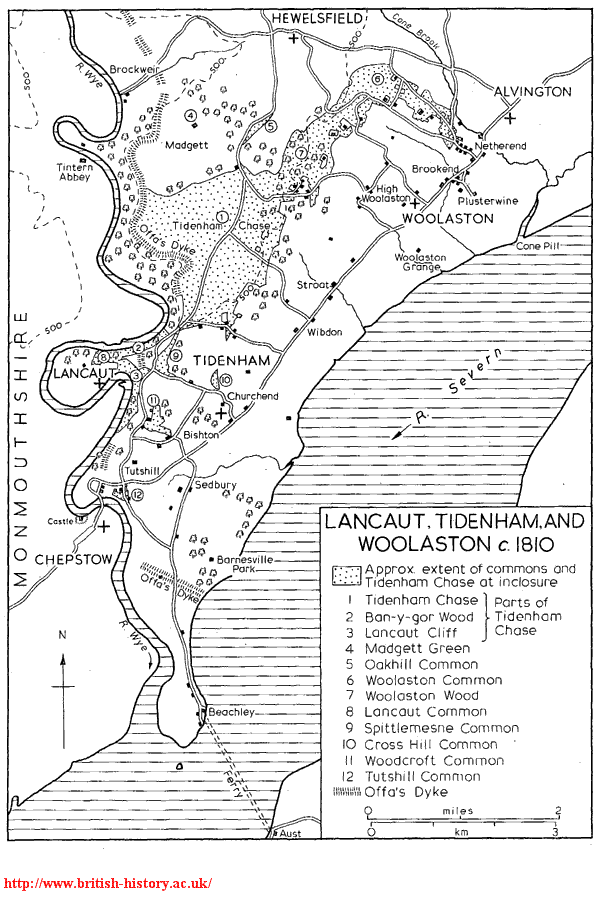 TIDENHAM lies on the boundary of Gloucestershire and Monmouthshire to the east of Chepstow. The parish forms a roughly wedge-shaped area between the broad estuary of the Severn on the east and the meandering course of the Wye on the west, tapering towards the south into a narrow peninsula at the confluence of the two rivers. Crossing points of the rivers, notably the Severn passage at Beachley, played an important part in the development of settlement, and fisheries were a major factor in the economy of Tidenham from late Saxon times when it was a large royal manor. Tidenham later became part of the Marcher lordship of Striguil whose lords created a hunting chase in the manor.